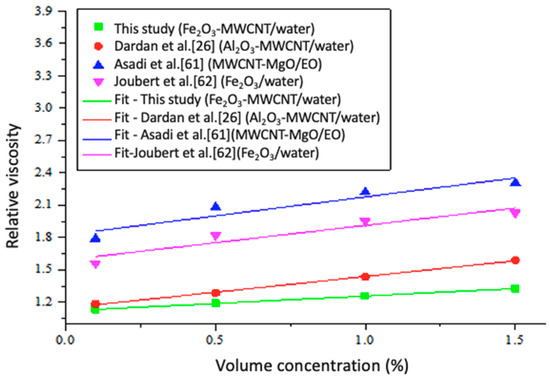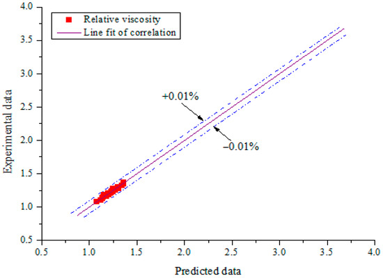 A plot of the fitted relative viscosity correlation for this work and those formulated in previous studies at 35 °C is presented in Figure 16 [26,61,62]. It shows that none of the existing correlations for estimating the viscosity of mono-particle and hybrid nanofluids could fit the obtained experimental data. They all overestimated the relative viscosity of the investigated MWCNT-Fe2O3/DIW nanofluid. The obtained relative viscosity of MWCNT-Fe2O3/DIW nanofluid was overestimated using the experiment-derived correlation for Fe2O3/DIW nanofluid [62]. This revealed a reduction (49.8%) in the viscosity of MWCNT-Fe2O3 (20:80)/DIW nanofluid because of the hybridization of Fe2O3 nanoparticles with MWCNT nanoparticles. With the evident reduction in the viscosity of MWCNT-Fe2O3/DIW nanofluid, the use of this hybrid nanofluid is favorable for engineering applications in terms of lower pumping power. A linear relationship was found to occur between the experimental and predicted data, as presented in Figure 17. An MOD of ±0.01% was found.