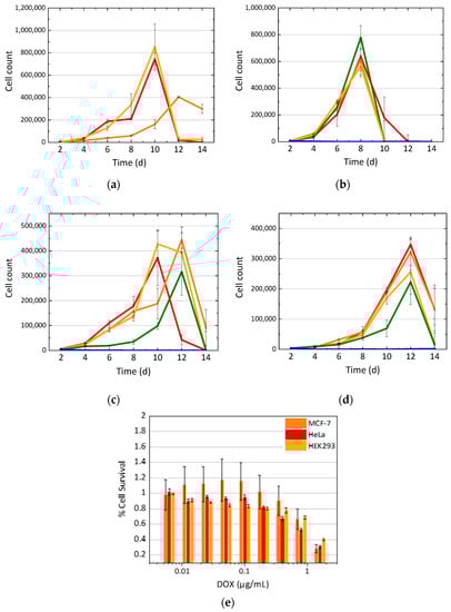 In order to assess the direct effect of chemotherapy drugs on the cell growth rate, we set the baseline and monitored cell growth rate of three different cell types: HeLa cells, a cervical cancer cell line; MCF-7, a breast cancer cell line; and non-cancerous control HEK293 cells, human embryonic kidney cells obtained by transforming primary cells with adenovirus DNA. Each cell type was grown over a period of 14 days, with cells counted every other day (Figure 1a). The control for the experiments in this work provided by the growth analysis of the untreated cells showed HeLa and HEK293 cell growth peaking at day 10, while the MCF-7 cell growth peak was slightly delayed to day 12. The subsequent growth decline was likely due to the overcrowding of the wells and a buildup of waste in the medium. After establishing a control baseline for cell growth, the cytotoxic effect of doxorubicin was further assessed. HEK293, HeLa, and MCF-7 cells treated with doxorubicin at the concentrations 0.05, 0.005, 0.0005, and 0.00005 μg/mL showed varying cell growth levels (Figure 1b–d, respectively). The highest concentration of doxorubicin used (0.05 μg/mL) proved to be too toxic to the cells, resulting in no measurable cell growth in all cell lines tested. In HEK293 cells, all concentrations other than 0.05 μg/mL showed a similar rate of growth, including the cells that had no drug added. HeLa cells showed varying growth rates per concentration, while MCF-7 cells exhibited a decreased growth rate as the concentration of doxorubicin increased. In order to supplement cell growth rate data with bulk cell viability, information of the percent of surviving cells was evaluated with the MTT cell viability assay. This study showed a concentration-dependent decline in cell viability with a calculated coefficient of determination (R2) value of 0.712 for HEK293 cells, 0.955 for MCF-7 cells, and 0.983 for HeLa cells (Figure 1e), thus indicating the proportion of variance in cell death due to doxorubicin toxicity. In the cell growth experiments, the cells were treated and counted for 14 days, while in the cell viability assay, the cells were only treated for 16 h. Therefore, the longer exposure during the cell counting experiments necessitated a lower concentration range than the MTT cell viability assay to avoid total cell death. It was anticipated that DOX treatment would have different effects in different cancer cell lines, in part due to the differences in their replication rates. However, both cancer cell lines exhibited a DOX concentration-dependent cell viability decrease, with a less steep trend seen in the HEK293 cells.