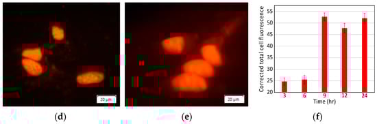DOX-N-GQD complexes were visualized in the cells using confocal fluorescence imaging at 3, 6, 9, 12, and 24 h time points after introduction into the cell media (Figure 3a–e) observed in confocal 3D cell images. Already at 3 h, substantial DOX emission was observed from cell nuclei. Lower intensity N-GQD fluorescence was also detected in the cells, thus suggesting their successful internalization as DOX.