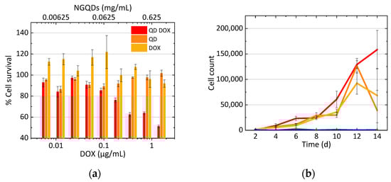 The efficacy of the N-GQD-delivered DOX was further evaluated via two separate assays: cell growth analysis and an MTT cell viability assay. The MTT assay served to verify both the efficacy of the treatment and the biocompatibility of the N-GQDs, thus also verifying their possible contribution to the toxic effect of the combined DOX-N-GQD formulation. The concentration of N-GQDs was matched to that in DOX-N-GQD complexes with corresponding DOX loading to allow for comparative analysis. As a result, N-GQDs alone showed very little toxicity to cells even at the highest concentration of 1 mg/mL, equivalent to DOX loading of 1.6 μg/mL, while the DOX-N-GQD formulation was shown to be more effective in treatment than doxorubicin alone (Figure 4a). N-GQDs alone at lower concentrations could even enhance cell viability because they can be degraded and metabolized by the cells [].