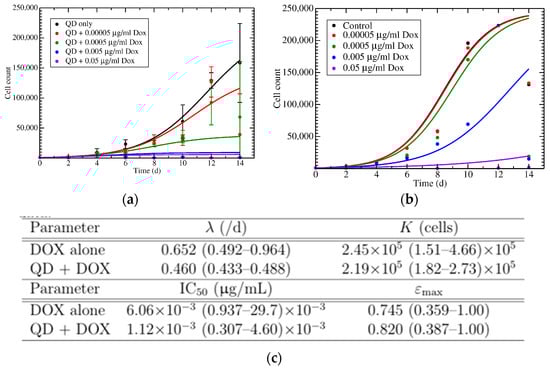 (a) Mathematical model fit to growth data of MCF-7 cells treated with DOX-N-GQDs. (b) Mathematical model fit to growth data of MCF-7 treated with DOX alone. (c) Best fit parameters with 95% confidence interval for MCF-7 cell growth.