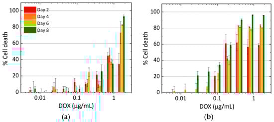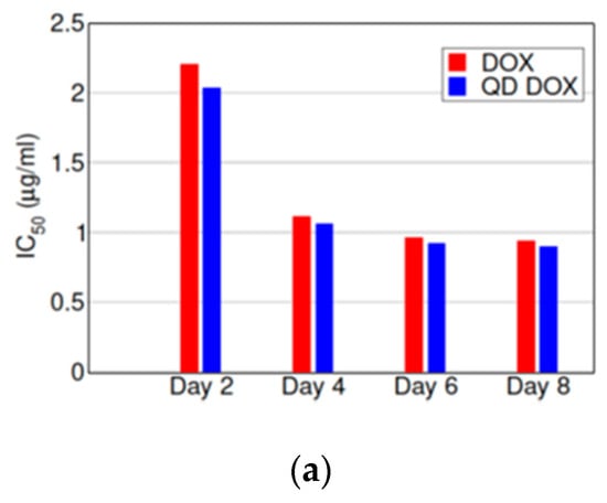 A measurement of cell growth based on cell count can be prone to some degree of observer error. To account for that, a different method (MTT assay) was used to measure cell death on days two, four, six, and eight to assess the growth rate of MCF-7 cells in the presence of doxorubicin and DOX-N-GQDs. These measurements showed a steady increase in cell death rate for both treatments over the eight-day period, as shown in Figure 6. The IC50 for the DOX-N-GQDs treatment of 0.97 μg/mL (with respect to DOX concentration) appeared to be substantially below the 1.77 μg/mL IC50 for DOX alone. These results resembled the results of the mathematical models of cell growth described above. We also point out that at low concentrations of the drug, cell growth over time could lead to increased cell numbers, even for longer treatments.