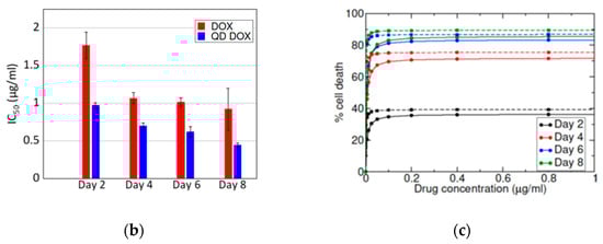 We further used the parameters determined from the aforementioned model fit to the cell growth data (Figure 5c) to simulate the MTT assays (Figure 7a). The simulations produced curves resembling those observed experimentally (Figure 7b), with increasing cell death rate over the eight-day period. The IC50 values obtained from the simulated data (Figure 7c) decreased with increasing measurement time and indicated that DOX-N-GQDs were more efficacious than doxorubicin alone.