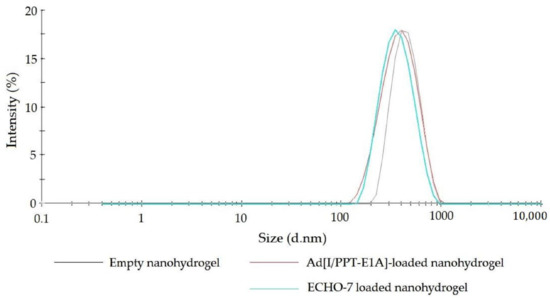 The particle size, PDI and zeta potential of the nanohydrogels were characterized by DLS and summarized in Table 1. The results demonstrated that all the nanohydrogels possessed an approximate particle size of 300–400 nm, with a relatively uniform polydispersity distribution as supported by the low PDI. In details, the particle sizes of the OV loaded nanohydrogels were 362 ± 19 nm and 347 ± 10 nm for Ad[I/PPT-E1A] and ECHO-7-loaded nanohydrogels, respectively; they were both around 50 nm smaller in diameter compared with respective empty nanohydrogels (426 ± 12 nm and 431 ± 13 nm). The greater size of the OV encapsulated nanohydrogels with the respect to the empty ones can be easily explained as follows: The empty nanohydrogel is composed of HA-SH polymer able to undergo to a swelling of large extent once in the hydrated state. OVs are composed of a nucleoprotein core and an icosahedral nonenveloped capsid possessing a size around 50–100 nm [65,66], which do not make a distinct variation of volume in the aqueous environment. The interior cross-linked matrix of the OV-loaded nanohydrogel was partly occupied by OVs, as a result, represented less swelling in the hydrated state. The replacement of the HA-SH swelling polymer of the nanohydrogel with the virus reduces the swelling tendency of the nanohydrogel, thus leading to a particle smaller in size.