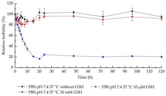 The nanohydrogel was cross-linked by disulfide bonds which has been identified can be cleaved by reduce agent, thereby inducing degradation of nanohydrogel in the environment with high GSH concentration [79]. To study the redox response ability of the nanohydrogel, different amount of GSH were added into the nanohydrogel PBS suspension pH 7.4, to achieve the final GSH concentrations of 10 μM and 10 mM in order to mimic the extracellular and intracellular circumstances, respectively [80]. The turbidity of the samples was monitored by detecting the scattering intensity using DLS. The degradation of nanoparticles can be directly detected according to reduce of sample turbidity and a relative turbidity % is calculated according to the Equation (2) in order to study the dynamic degradation progress [81].