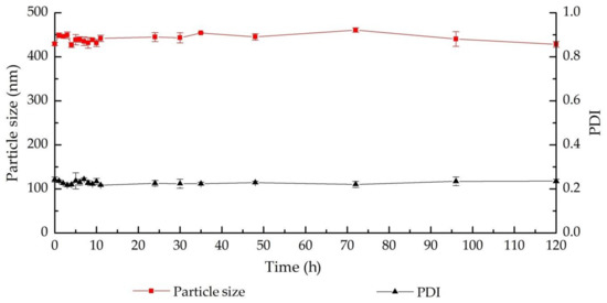 Characterization of the nanohydrogel stability in phosphate buffered saline (PBS, 10 mM, pH 7.4) at 37 °C by particle size and PDI determination.