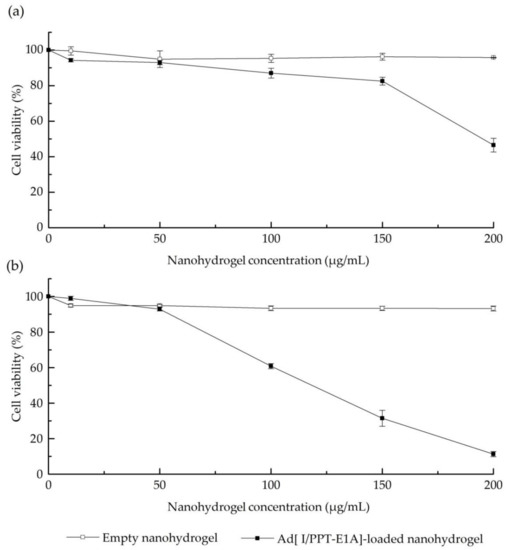 3-(4,5-dimethyl-2-thiazolyl)-2,5-diphenyl-2H-tetrazolium bromide (MTT) cytotoxicity assays in LNCaP metastatic prostate cancer cell line of: (a) Empty nanohydrogel vs. Ad[I/PPT-E1A]-loaded nanohydrogel after 3 days infection; (b) Empty nanohydrogel vs. Ad[I/PPT-E1A]-loaded nanohydrogel after 5 days infection.