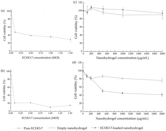 3-(4,5-dimethylthiazol-2-yl)-5-(3-carboxymethoxyphenyl)-2-(4-sulfophenyl)-2H-tetrazolium (MTS) cytotoxicity assays in HT29 colon cancer cell line of: (a) ECHO-7 after 5 days infection; (b). ECHO-7 after 7 days infection; (c) Empty nanohydrogel vs. ECHO-7-loaded nanohydrogel after 5 days infection; (d) Empty nanohydrogel vs. ECHO-7-loaded nanohydrogel after 7 days infection.