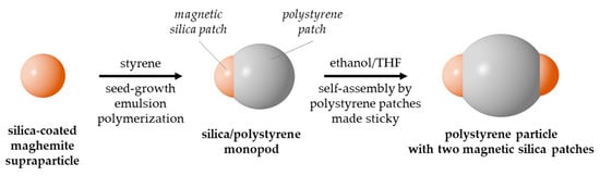 The paradigm shift that we propose here is to consider the synthesis of particles with several magnetic patches through the self-assembly of monopatch particles by fusing their nonmagnetic components. It concerns polymer-based particles, and we drew inspiration from some reports that relate to nonmagnetic colloids. Micron-sized asymmetric dumbbells made of a polystyrene (PS) sphere and a poly(n-butylacrylate) lobe self-assemble into well-defined clusters when dispersed in aqueous media, when the desorption of the poly(vinylpyrrolidone) stabilizer from the particles triggers the merging of the soft poly(n-butylacrylate) lobes upon contact through collision [18]. Later, other researchers fabricated by a microfluidic technology 200 µm hydrophilic poly(ethylene glycol) diacrylate particles with a 160 µm ethoxylated trimethylolpropane tri-acrylate lobe [19]. They obtained quite regular submillimeter-sized clusters by drying Pickering-like water droplets stabilized from these particles. More recently, we reported that dumbbell-shaped silica/PS nanoparticles can self-assemble in regular clusters by incubation in mixtures of bad/good solvents for PS, i.e., ethanol/dimethylformamide (DMF) mixtures [20]. In such conditions, the partial swelling of the PS patch makes it sticky enough to attract and merge to the PS patches of other particles.