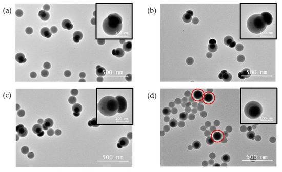 As seen in the TEM images (Figure S1), even if the difference in contrast between silica and PS is sufficient to distinguish both phases, the exact particle morphological interpretation is strongly dependent on its orientation on the TEM grid. Indeed, it is not so easy to determine whether the silica core protrudes out of the surface of the PS particle or else it is just below the surface covered at this position by a thin polymer layer. Because this criterion is critical to our end goal of obtaining accessible inorganic patches, we collected 1 mL of each monopod batch (entries #1.3 to #1.6) and added ethanol NH4OH and TEOS, i.e., experimental conditions expected to promote the silica core regrowth [28]. Figure 2 shows the TEM images of each batch taken after this treatment. We can observe for the three batches prepared from seeds with 0.6 ≤ dMPS ≤ 1 funct./nm2 the presence of a silica protrusion attached to the silica core indicating its accessibility to the reagents (Figure 2a–c). However, this was not true for the last batch (dMPS = 2 funct./nm2): new silica particles, circled in red in Figure 2d, did appear but separately from the silica/PS nanoparticles. Therefore, the latter is not composed of monopods as expected, because the silica core is fully encapsulated in the PS particle. Such decentered core-shell particles result from a degree of PS on silica wettability that is too high, as reported by Reculusa et al. [30] and Lang and coworkers [31,32] under quite similar conditions.