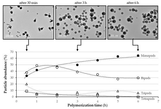 We first studied the polymerization experiment carried out on seeds with dMPS = 0.5 funct./nm2 (Figure 3). We observed that after 30 min, monopods, bipods, tripods and tetrapods coexisted and that bipods were the main population. As the polymerization progressed, the size of the PS nodules increased, and the tetrapods, tripods and bipods gradually disappeared in favor of the monopods whose abundance increased from 33% to 63% after 6 h. This growth mechanism is consistent with Thill’s model that we reported a few years ago [29,33]. This means that the nucleation of PS particles leads to the coexistence of several PS nodules on the silica seed. As they grow, i.e., as the seed surface is increasingly crowded, they can move, coalesce and/or leave the seed. Here, coalescence seemed to be the preferred scenario because the proportion of free particles appeared to be constant and the bipods after 6 h were dissymmetric with both nodules of different size. Thill’s model also makes it possible to explain the non-negligible quantity of bipods, which remain at the end of the polymerization. Indeed, when there are only two nodules of PS left on the surface, the coalescence probability is almost zero if they are positioned at an angle of 180°, because they can thus grow to an infinite size independently. Thus, this growth mechanism is not favorable to obtain pure batches of monopods.