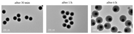 To check that the surface of the silica was not covered by even a very thin PS layer, we carried out a step of silica regrowth before TEM observation, according to the following operating mode [28]. To 1 mL of the particle dispersion in ethanol or water, we added 45.5 mL ethanol and 3.5 mL NH4OH. Then, we added dropwise a solution of 3.8 mL TEOS (10 vol.% in absolute ethanol) using a single-syringe pump (1 mL/h). The particles were washed using two centrifugation/redispersion cycles in ethanol (12,000× g; 10 min).