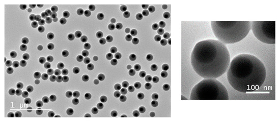 The morphology and size of colloids were studied for each batch by transmission electron microscopy (TEM) using a JEM 1400+ LaB6 apparatus sourced from JEOL Europe SAS (Croissy-sur-Seine, France) operating at 120 kV. The samples were prepared by directly depositing a drop of the colloid dispersion on the TEM grids. Statistical image analyses were performed over at least 150 nanoparticles. Size polydispersity indexes were calculated from the weight average and number average diameter values according to Equation (5):