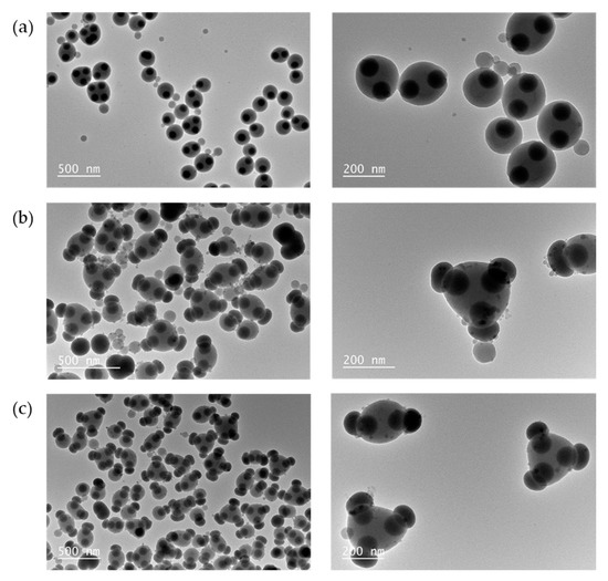 We prepared batches of size-monodisperse silica seeds with a diameter of 100 nm and surface methacryloxypropyl groups at nominal grafting densities from 0.3 to 2 funct./nm2. Each one was then used as seeds in an emulsion polymerization process of styrene [21,29] in order to find the optimized conditions to promote nucleation and growth of a single PS nodule on each silica seed. It is worth mentioning that high amounts of free PS particles, i.e., which do not contain a silica core, were also observed in the TEM images (Figure S1). Nevertheless, they may be easily removed by two centrifugation cycles. The features of the as-obtained batches and their statistical morphological analysis from TEM images are summarized in Table 1. The lower the nominal grafting density (entries #1.1 and #1.2), the higher the number of PS nodules (up to 4 and 3, respectively). Therefore, the number of monopods was too low. From 0.6 to 2 funct./nm2 (entries #1.3 to #1.6), monopods were systematically obtained with morphological yield as high as 99%. This phenomenon may be explained as follows: the higher the nominal grafting density, the more organophilic the silica surface, the smaller the contact angle of the growing PS nodules on the silica seed and, therefore, the lower their surface mobility and the easier it is for them to merge into a single nodule. This is particularly evidenced by the diameter of the PS nodule of the monopods, which is systematically much higher than that of the free PS particles that have grown independently from the silica seeds.