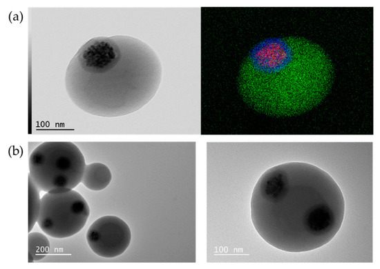 (a) STEM image (left) and EDX elemental mapping (right) of a representative magnetic silica/PS monopod (red, blue and green pixels represent iron, silicon and carbon, respectively) corresponding to the entry #3.6 of Table 3; (b) TEM images of PS particles with several magnetic patches as obtained after assembly of the magnetic monopods, corresponding to entry #3.6 of Table 3 collected at t = 30 min, using the optimal conditions as defined in entry #2.4 of Table 2.