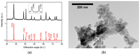 Following the earlier works of Inui et al. [38] and Mohanty et al. [41], we achieved a systematic variation of the reaction conditions with the aim to better understand the reaction pathways and growth mechanisms possibly leading to LN nanocrystals with adjustable size and morphology. The synthesis temperature was fixed at 230 °C, namely, 20 °C below the maximum temperature that can be reached by the autoclave for a short period of time. As a reference synthesis, 5 mL of the commercial precursor solution corresponding to a volume fraction of 22% of the Teflon cup was first thermally treated for a period extending from 48 h to 72 h. After 3 days, the absence of a significant amorphous contribution was attested from the flat baseline observed in the corresponding XRD profile, showing formation of pure lithium niobate (Figure S1). In Figure 1, the X-ray diffraction pattern obtained after 3 days was further illustrated with a special emphasizes on the different FWHMs of the main (hkl) reflections. Deviations in terms of relative intensities and peak broadening were clearly visible after comparison with the reference pattern (ICSD # 80628). In addition, if a platelet morphology was also suggested from the corresponding TEM image, the shape anisotropy was more readily assessed from the apparent nanocrystal size Shlk derived from the XRD data, which is summarized in Table 1 for the most intense (hkl) reflections.