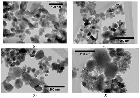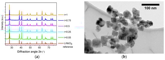 If a substantial decrease in the corresponding S012 values was observed below r = 0.5, together with a significant reduction of the shape anisotropy comparatively to the reference synthesis, we found that TEM imaging (Figure 2) also revealed that the size polydispersity was severely affected for r > 0.5. Monocrystalline nanoparticles of very different sizes were clearly observed, indicating, as discussed in Appendix A, that the mean nanocrystal size derived from the XRD data must be considered with caution for very polydisperse samples. Interestingly, the size increase at high 1,4-butanediol content was consistent with the formation of micrometer disk-shaped particles produced when lithium acetate and niobium ethoxide are solvothermally treated in pure 1,4-butanediol [38,39], indicating a low nucleation rate in that case. On the contrary, nanocrystal growth was less predominant for the r values fixed between 0.05 and 0.5. The mean nanocrystal size calculated at about 30 nm was then in good agreement with the TEM images for these samples showing the best characteristics in terms of size and shape anisotropy.