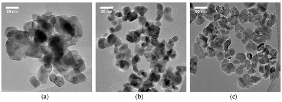 TEM images of LiNbO3 nanocrystals showing the influence of the glycol chain length for a molar ratio of glycol to ethanol at r = 0.5. For a precursor volume fixed at 5 mL, we added (a) 3.1 mL of 1,3-propanediol, (b) 3.8 mL of 1,4-butanediol, and (c) 4.5 mL of 1,5-pentanediol.