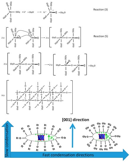 Scheme of the reaction pathway leading to LiNbO3 nanocrystals with different shape anisotropy. GlyO and EtO are glycoxy and ethoxy groups corresponding to −OC4H8OH and −OC2H5, respectively. The reactions (3) and (5) and the subsequent condensation reactions are described in the text. An oxygen octahedra (in blue) surrounding Nb5+ ions is also illustrated in the lower panel together with the spontaneous polarization Ps (green arrow) pointing towards the [001] direction.