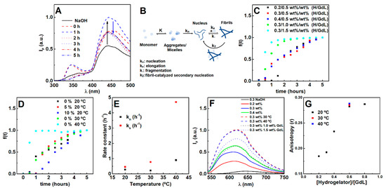 Once gelation is initiated (after the addition of GdL), both emission bands increase, indicating the occurrence of a reorganization process. Here, the models of Knowles et al. [34] and Cohen et al. [35] (commonly used for β-amyloid aggregation) were also used as a strategy to assess the possible occurrence and influence of monomer independent (k-; fragmentation) and/or monomer dependent (k2; fibril-catalyzed secondary nucleation) secondary pathways (Figure 1B).
