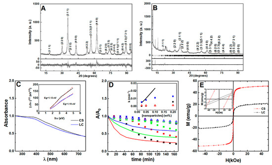 Nanoparticles of manganese ferrite with different coatings were prepared using different synthetic methods, and are named, from now on, as citrate-stabilized or lipid-coated manganese ferrite nanoparticles. The X-ray diffraction (XRD) patterns of both samples present well-defined peaks (Figure 2A,B) characteristic of a crystalline structure, which was obtained without calcination. The diffraction peaks of the MnFe2O4 crystalline spinel structure are observed at 2θ = 29.7° (2 2 0), 34.9° (3 1 1), 36.5° (2 2 2), 42.5° (4 0 0), 52.7° (4 2 2), 56.2° (3 3 3) and (5 1 1), 61.8° (4 4 0), 65.0° (5 3 1), 70.1° (6 2 0), 73.1° (5 3 3), 74.0° (6 2 2), 78° (4 4 4), 85.6° (6 4 2), 88.5° (7 3 1) and (5 5 3), according to CIF file 2300618 (space group Fd-3m). Rietveld analysis was performed using the FullProf software suite, confirming the spinel structure. As in previous works [45,46], we considered it to be important to use microabsorption correction [47], resulting in fits with good RF values. The calculated parameters are presented in Table S3 in Supplementary Materials, offering a larger size of the crystalline domains in the nanoparticles that are citrate-stabilized. Additional diffraction peaks were observed for the lipid-coated nanoparticles, occurring at positions similar to those reported for layered manganese laurate [48], which can be ascribed to ordered lauric acid molecules at the surface of manganese ferrite.