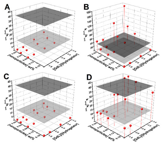 An empirical equation was used to assist the estimation of the conditions required to maximize the homogeneity of the gel (see deduction, discussion and Figure S2 in Supplementary Materials). Figure 3 displays plots of the obtained kemp/ksed for various nanoparticle concentration and GdL-to-hydrogelator concentration ratio. The estimation implies that the gelation conditions have to guarantee a kemp/ksed > 41.7, so that when gel fraction f(t) attains 0.9, the nanoparticles suspended fraction is also at 0.9 (if = 1 and = 0.5 is assumed).