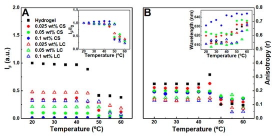 (A) Nile Red (2 µM) maximum fluorescence emission dependence on the temperature of hydrogel, citrate-stabilized (CS), and lipid-coated (LC) nanoparticles containing magnetogels. Inset: Normalized maximum fluorescence emission dependence on the temperature of the respective gels. (B) Nile Red fluorescence anisotropy dependence on temperature. Inset: Nile Red maximum emission wavelength dependence on temperature.