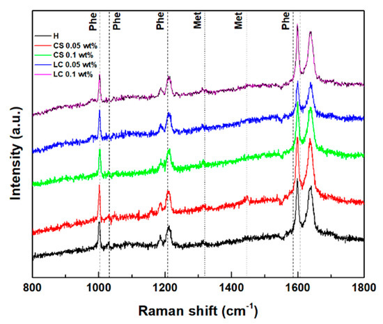 Raman scattering spectra of the hydrogel and magnetogels containing lipid-coated (LC) and citrate-stabilized (CS) nanoparticles. Vertical lines represent the reported Raman shifts of methionine (Met) and phenylalanine (Phe).