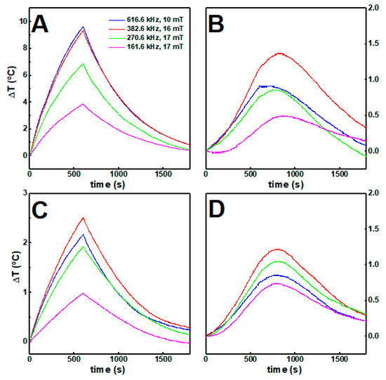 The temperature variation over time of (A) citrate-stabilized and (B) lipid-coated nanoparticles at 1 mg/mL (0.1 wt%) in water and in gels (C,D) respectively) under different magnetic field strengths and frequencies.