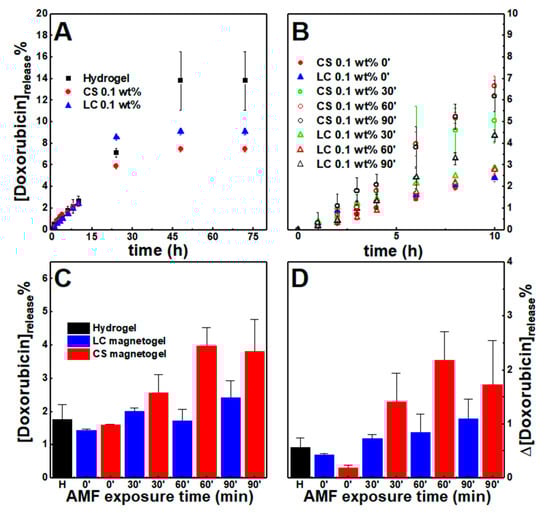 In a previous drug release assay of hydrogels, a mixed behavior of gel erosion and drug diffusion was observed [8]. Doxorubicin release from the hydrogel and magnetogels to pH = 7 buffer (to keep pH conditions constant and neutralize gels) was assessed.