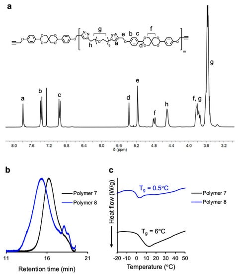 Having the three monomers in hand, we then synthesized the target spirocyclic polyacetals (7) and (8) via CuAAC “click” polymerization using CuBr and TMEDA in DMF at 60 °C for 24 h (Scheme 2). In all these reactions, a slight excess of dialkyne-decorated monomer was used to increase the possibility of end-capping the polymers with this functionality and to inhibit the formation of cyclic polymers. However, the formation of the latter cannot be entirely excluded. The resulting polymers were purified by a combination of dialysis against DMF using a 3500 MWCO membrane, to remove any unreacted monomers and low molecular weight oligomers, and washed with ammonia to remove the copper catalyst. The 1H NMR analysis of 7 demonstrated the formation of 1,2,3-triazole rings in the polymer backbone as evidenced by the peak at 7.79 ppm (Figure 1a). In addition, the peak at 5.37 ppm, corresponding to the two acetal protons, confirms the presence of the spirocyclic acetals in the polymer structure. Similar 1H NMR spectrum was obtained for 8 (Supplementary Materials Figure S10). As shown in Figure 1b, using SEC, Mn values of 15,900 and 73,000 g/mol with dispersity indices of 2.47 and 3.07 were obtained for 7 and 8, respectively. It is noteworthy that CuAAC polymerization is a step-growth polymerization for which relatively high Đ values are expected. Moreover, the chain length distributions of the PEG starting materials carry on and amplify throughout the polymerization, which contributes significantly to Đ broadening of the target polymers. We then used DSC to gain insight into the thermal behaviour of the polymers. The results demonstrate that both 7 and 8 are amorphous with comparable glass transition temperatures (Tg) at 6 and 0.5 °C, respectively (Figure 1c). As noted earlier, relatively high Tg values for this class of polymers are often obtained due to the nature of the spacers and the rigidity of the polymer backbone [34,35,38]. In 7 and 8, the PEG spacers between the spirocyclic acetal moieties impart adequate flexibility to render them amorphous at room temperature.