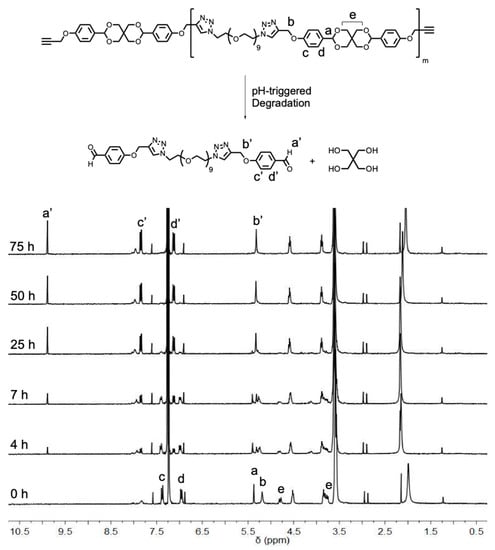 Figure 2. A pH-triggered degradation reaction of 7 in acidic media (top) monitored by 1H NMR spectroscopy (bottom).