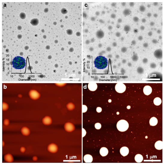Figure 3. (a,b) TEM and AFM images of P1. Inset showing the DLS data and a cartoon representation of the particles. (c,d) TEM and AFM images of P2. Inset showing the DLS data and a cartoon representation of the particles.