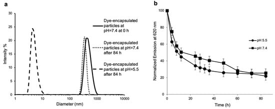 To investigate the effect of pH in the model drug release, we performed the same experiment at pH = 7.4 (10 mM phosphate buffer) at 37 °C. Surprisingly, a comparable release profile, with slightly slower liberation of Nile red, was observed (Figure 4b). We hypothesise that due to the amphiphilic nature of the core of the particles, water has the ability to penetrate inside and come into close contact with Nile red molecules, altering the surrounding environment and quenching their fluorescence. In addition, such burst release is often observed in polymeric nanoparticulate systems in which the cargo is noncovalently encapsulated in their core [1,2]. In fact, DLS analysis of the dye-loaded particles after 84 h of incubation showed that those in acidic media (pH = 5.5) were completely degraded to their small molecule building blocks (Figure 4a), which is strong evidence of their effective degradation in an acidic aqueous medium, while those at pH = 7.4 kept their integrity, as only minimal change in their size was observed (Figure 4a). Such a small change in the size of particles in buffer at pH = 7.4, compared to DI water, can be attributed to the presence of salts in the buffer solution. This suggests that while the spirocyclic polyacetal-based assemblies are leaky in their nature, the presence of acetal linkages ensures their effective degradation under acidic conditions, which is highly desirable for any drug delivery vehicle to potentially facilitate its clearance from body.
