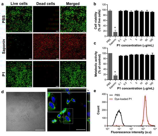 Figure 5. (ac) CHO-K1 cells were treated for 24 h with increasing concentrations of P1 and cell viability was measured by means of the (a,b) live/dead assay and by (c) resazurin-based metabolic activity. (a) Representative fluorescence microscopy images showing the distribution of lived (green; calcein AM) and dead (red; ethidium homodimer) cells after treatment with particles (100 μg/mL). The scale bar is 100 µm. (b,c) The data represent mean ± S.D. of at least three independent experiments performed in triplicate. The results were analyzed using the Student’s t-test and the statistical difference (between vehicle-treated control cells (PBS) and treated cells) was established at * p ˂ 0.01. (d) Representative differential interference contrast (DIC) and fluorescence confocal microscopy images of CHO-K1 after 4 h incubation with 100 μg/mL of dye-loaded particles (red). The plasma membrane is stained in green and the cell nucleus in blue. The scale bar is 50 μm. (e) A flow cytometry diagram showing the plasma membrane adsorption and cellular uptake of dye-loaded P1.