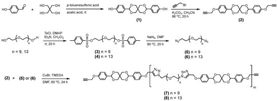 To construct our target polymers via CuAAC “click” polymerization, we envisioned the synthesis of dialkyne-decorated spirocyclic acetal and diazide-functionalized PEG monomers. Our synthetic strategy is shown in Scheme 2. The use of starting materials from biorenewable resources is of significant interest as a viable alternative to fossil-based materials due to the ongoing concerns regarding the environmental impact of the latter on the planet. In this context, we chose pentaerythritol and 4-hydroxybenzaldehyde as starting materials for the synthesis of our dialkyne-containing monomer. 4-Hydroxybenzaldehyde is considered as one of the three aromatic 4-hydroxyaldehydes, alongside vanillin and syringaldehyde, derived from lignin, the second most abundant naturally occurring polymer and an excellent source of biobased aromatic feedstocks [45]. Although pentaerythritol is not a bio-sourced compound, it is produced commercially from formaldehyde and acetaldehyde and is an attractive polyol for the synthesis of spirocyclic acetals because of its low cost [34]. Double protection of this compound using 4-hydroxybenzaldehyde under acidic conditions resulted in the formation of spirocyclic acetal (1) with phenol functional groups. The subsequent reaction of 1 with propargyl bromide using potassium carbonate as base provided our “clickable” dialkyne-functionalized spirocyclic acetal (2) in 64% yield (Scheme 2). To render the final polymers and their corresponding particles dispersible in aqueous media, we chose diazide-functionalized PEG as the complementary monomer to 2. In order to investigate the effect of hydrophilic segment chain length on the size of the resulting assemblies, PEG with Mn (number average molecular weight) values of 400 and 600 g/mol were selected, corresponding to the degree of polymerization of 10 and 14, respectively. Ditosylation of these PEG molecules followed by their reaction with sodium azide in DMF afforded the two diazide-decorated PEG target monomers 7 and 8 (Scheme 2).