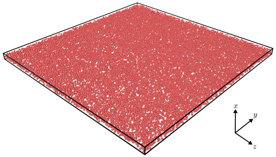 Visualization of the fluid particles in a slit pore of height , chemical potential , and temperature . The fluid particles are rendered in red, and their diameter is rendered at . The solid is not rendered. The solid lines illustrates the edges of the simulation box. The simulation was rendered with Open Visualization Tool (OVITO) [45].