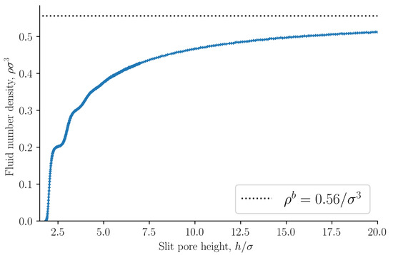 The fluid number density is presented in Figure 3 as a function of the slit pore height h. The bulk fluid number density in equilibrium with the slit pore is shown as a dashed line. The fluid number density converges to the bulk value as the slit pore height approaches infinity. The volume V depends on the choice of the fluid–solid dividing surfaces. We have chosen the dividing surfaces to be at and . The choice of the dividing surface determines how rapidly the slit pore values converge to the bulk values. A dividing surface closer to the fluid phase will reduce the volume and consequently the slit pore values will converge faster to the bulk values. Other choices of the dividing surface are possible.