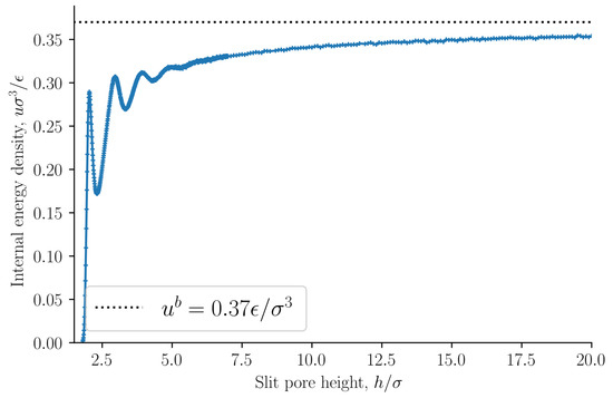 Internal energy density as a function of slit pore height h. See Equation (35). The dashed line shows the internal energy density of the bulk .