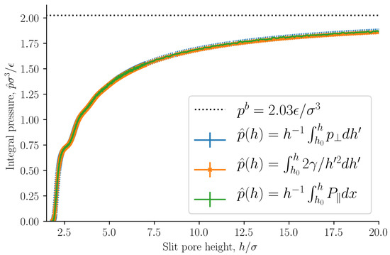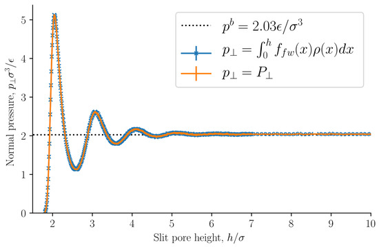 The normal pressure was identified as the normal mechanical pressure in Equation (31). It is presented in Figure 7 as a function of the slit pore height h. The normal pressure was also calculated from the local fluid density and the fluid–solid force using Equation (32). The two methods of calculating the normal pressure agree, which indicates that we have calculated the mechanical pressure tensor correctly.