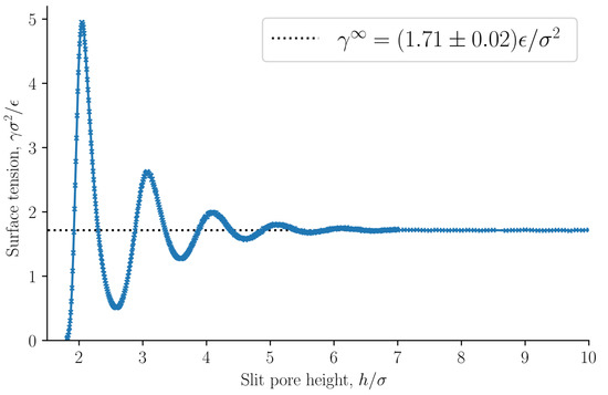 When and , it follows from Equation (8) that the integral and differential surface tensions are equal . The surface tension as a function of the slit pore height is presented in Figure 8, see Equation (33). The surface tension at infinite separation is computed as the average surface tension of the slit pore, with height , at which point the surface tension is independent of h.