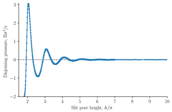 The disjoining pressure was computed from Equation (25), and is shown as a function of the slit pore height h in Figure 9. The disjoining pressure was here defined to be equal to the integral normal pressure minus the normal pressure at infinite separation. Because the integral and the differential normal pressures are the same and because the normal pressure at infinite separation is equal to the bulk pressure, in this case, the definition contain the commonly used definition of the disjoining pressure [7,29]. The normal pressure is constant for slit pore heights . Consequently, the normal pressure at infinite separation can be calculated as the normal pressure when . The normal pressure at infinite separation is equal to the pressure in a bulk fluid with the same temperature and chemical potential.