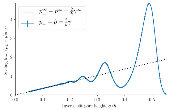 Figure 10 shows how the normal pressure minus the integral pressure scales with inverse slit pore height. It is equal to the scaling law presented in a previous work [23]. The slope of this ideal curve is equal to two times the surface tension. When the inverse slit pore height approaches zero, i.e., when the walls are far apart, the normal pressure and integral pressures are equal as predicted. For pores that are so small that no bulk fluid can form in the center, the structuring at the walls starts to overlap, and a fluctuating difference is seen in the difference of the normal and integral pressures. In the region of the straight line, we have a scaling law, that relates states of different heights. At heights smaller than approximately the scaling law breaks down, the difference of the two pressures starts to oscillate. There are positive and negative deviations from the law.