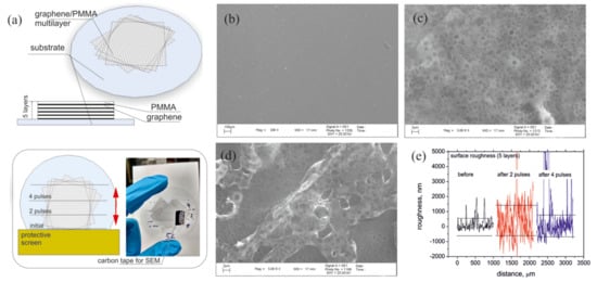 (a) Schematic representation of graphene/polymer sandwich on the top of SiO substrate and sketch of the ion bombardment experiment, in which increasing of the radiation dose was changed by moving the copper protective screen. Photographic image shows the graphene/polymethyl methacrylate (PMMA) sandwich on the fused silica substrate. (b–d) SEM images of the sample comprising 5 graphene/PMMA bi-layers before (b) and after irradiation with two (c) and four (d) ion pulses. (e) Roughness profile of the samples surface before (black) and after irradiation with 2 (red) and 4 (blue) pulses.