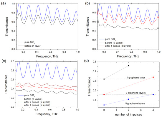 Figure 3a–c show the transmittance spectra of graphene/PMMA sandwiches before and after irradiation with the ion beam. The oscillations of the transmittance are caused by interference in the 0.53 mm-thick silica substrate (dielectric constant of silica is 3.5). In the frequency range of 0.2–1.4 THz, silica reflects about 20% of the incident radiation at negligible absorption. Since the PMMA spacers are transparent for the THz radiation, the THz losses in the graphene/PMMA sandwich placed on the fused silica substrate are due to graphene sheets. One can observe from Figure 3d that untreated samples comprising 1, 3 and 5 graphene/PMMA bi-layers absorb 35%, 45% and 55% of radiation at a frequency of 0.6 THz, respectively.