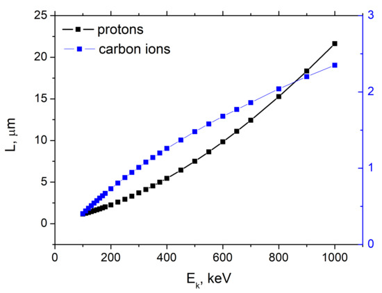 One can observe from Figure 6e,f that ionization losses of protons in the PMMA have typical Bragg dependence [34], i.e., the losses increase according to Equation (2) until the moment when the slowed-down proton captures a target electron, after which the ionization losses drop sharply.