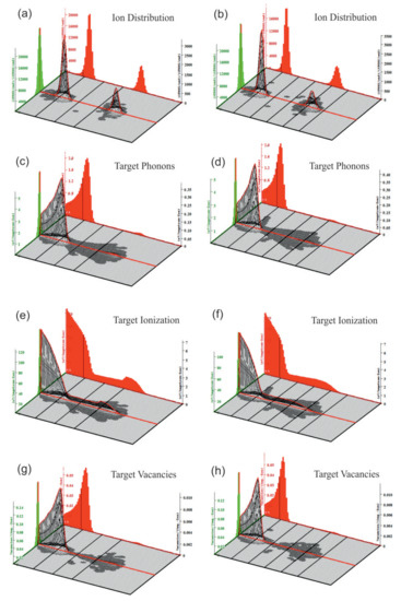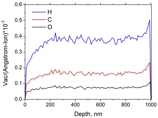 Vacancies distribution in the samples are demonstrated in Figure 6g,h. One can see that carbon ions dominate the vacancies formation, while the influence of proton is negligible.