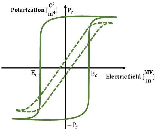 Electric field polarization hysteresis loops for a ferroelectric polymer (e.g., the PVDF, solid line) and for a relaxor ferroelectric polymer (e.g., the P(VDF-TrFE-CTFE), dashed line). Pr and Ec indicate the remnant polarization and the coercive field, respectively.