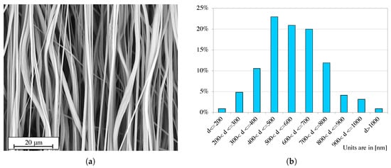 (a) SEM image of one specimen of the aligned nanofibers mat. (b) Histogram of the % distribution of the nanofibers’ diameters in three specimens.