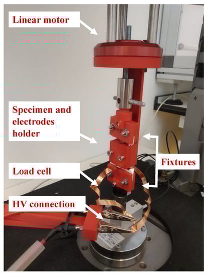 The set-up consists of the test instrument ElectroPuls E1000 (Instron™, Norwood (MA), USA, www.instron.us), equipped with an optical encoder and the Instron™ static load cell 2530-5N, which has a capacity of 5 N and a sensitivity of 1.6 mV/V to 2.4 mV/V at static rating. Figure 3 shows how the specimen is mounted in the Instron test instrument, i.e., the specimen is held by means of two fixtures, which have been 3D printed in ABS material. To apply the electric field to the specimen, a 3D printed electrodes holder has been realized that can internally host the electrodes (of dimensions mm) and the specimen in a groove of about 0.2 mm depth. The electrodes are glued on the 3D printed holder and are in contact with the specimen but are at a fixed position, which allows for the contraction of the specimen with negligible friction. The presence of air between the electrodes and the specimen is limited, preventing dielectric breakdown at the values of the applied electric field.